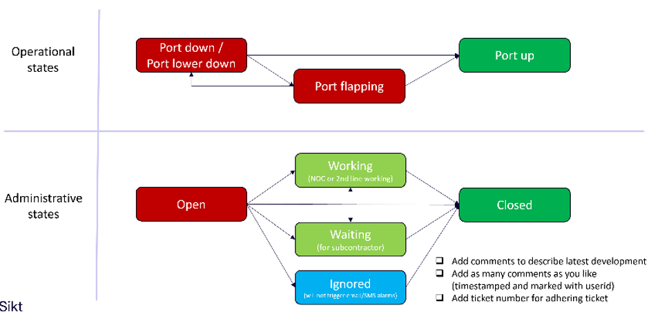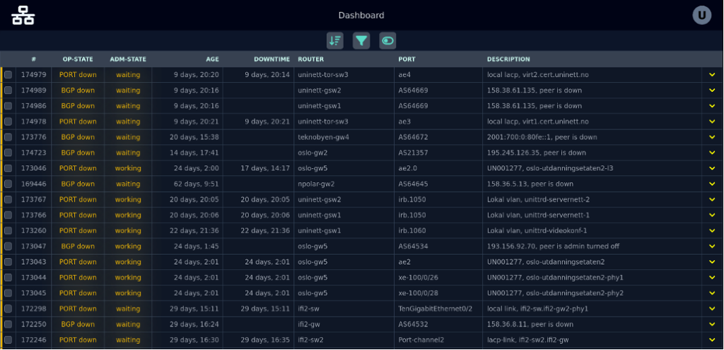 Three variants of the front-ends are implemented; a web based, a terminal based and an X11-based. The front-end gives NOC operators and network engineers an at-a-glimpse overview of the network state and an easy and consistent way to manage the alarms, providing a minimal “event handling system”, in that you can set an event to either working, waiting, ignored or closed states. Events can also be annotated with comments during the whole process of resolving the incident at hand.